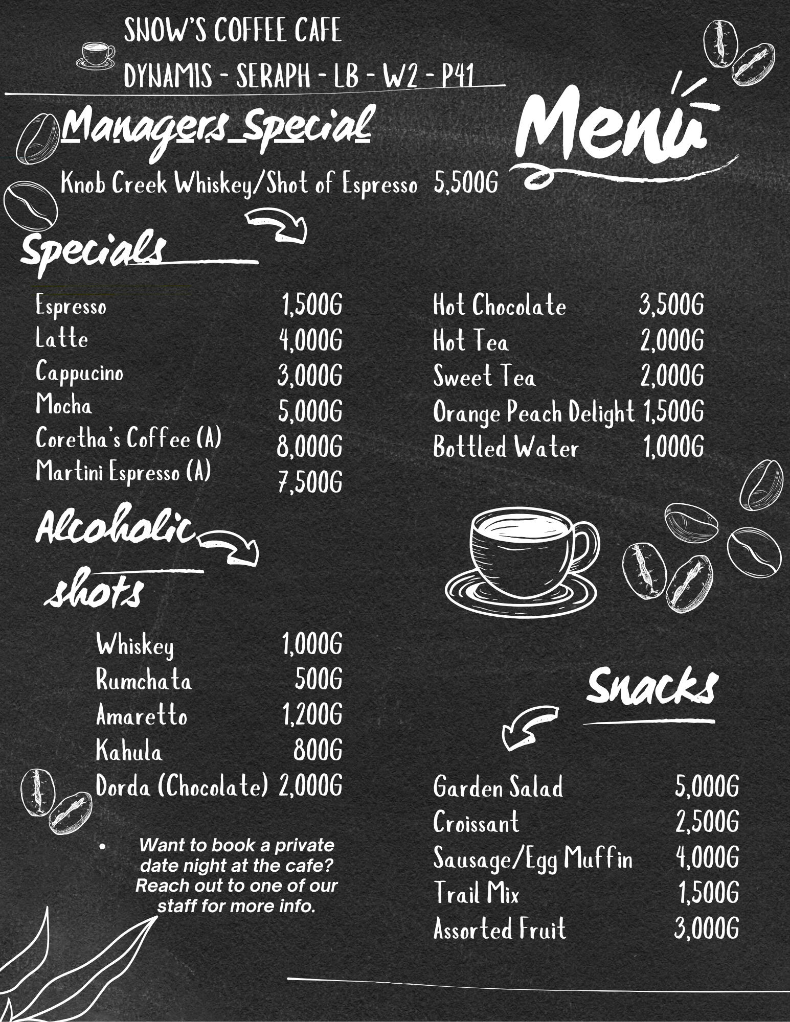 Snow's Coffee Cafe is a cozy and inviting coffee shop that offers a warm escape from the chilly outdoors. The cafe's name evokes the feeling of comfort and relaxation, much like a snowy day spent indoors with a hot cup of coffee. Inside, you'll find a cozy atmosphere with rustic, wood accents, soft lighting, and plush seating, making it the perfect place to unwind or catch up with friends.